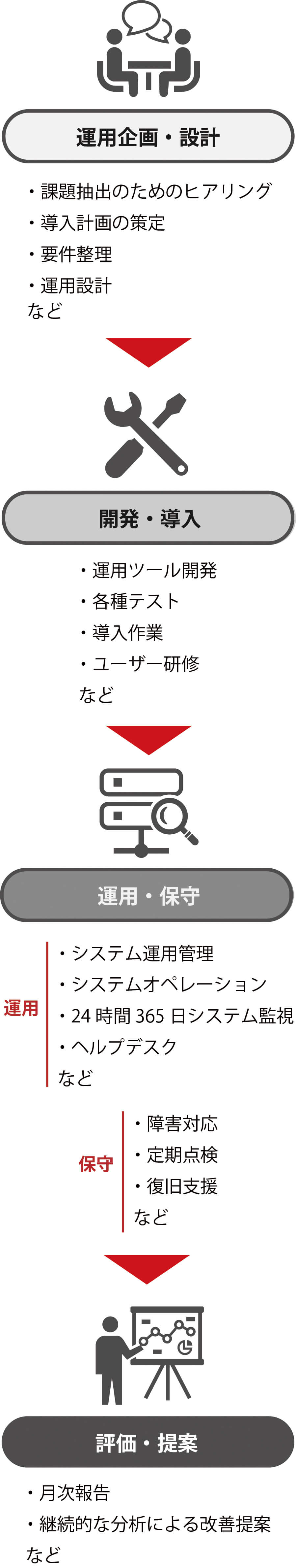 当社では、こうした業務の他に、ヒアリングや現状分析から始まる「運用の企画・設計」、運用ツールの開発や導入作業などを含む「開発・導入」、さらにはシステム利用者からの問合せや障害発生時の窓口となる「ヘルプデスク」の設置、そして運用状況を分析し新たに発生した課題を解決につなげていく「評価・提案」なども含めて総合的にサポート。ITIL技能を修得したエンジニアによる、ITILに準拠した運用・保守にも対応しています。